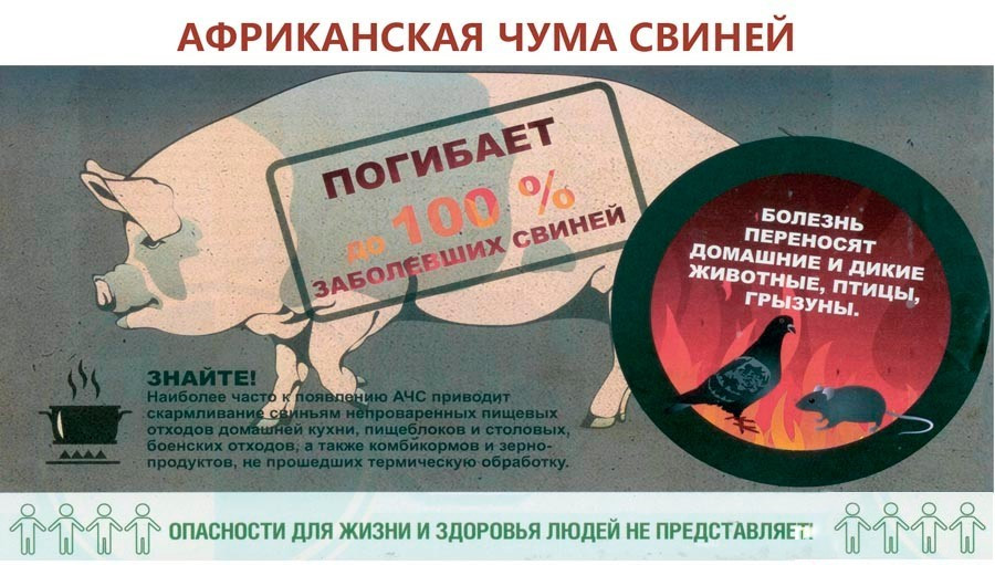 Африканская чума свиней – особо опасная, острозаразная, вирусная болезнь. В России впервые зарегистрирована в 2007 году. Вирус поражает диких и домашних свиней всех пород и возрастов в любое время года. Для жизни и здоровья людей опасности не представляет.