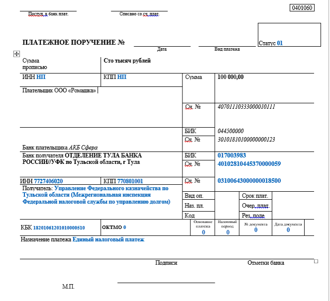 ПРИМЕР ПЛАТЕЖНОГО ДОКУМЕНТА