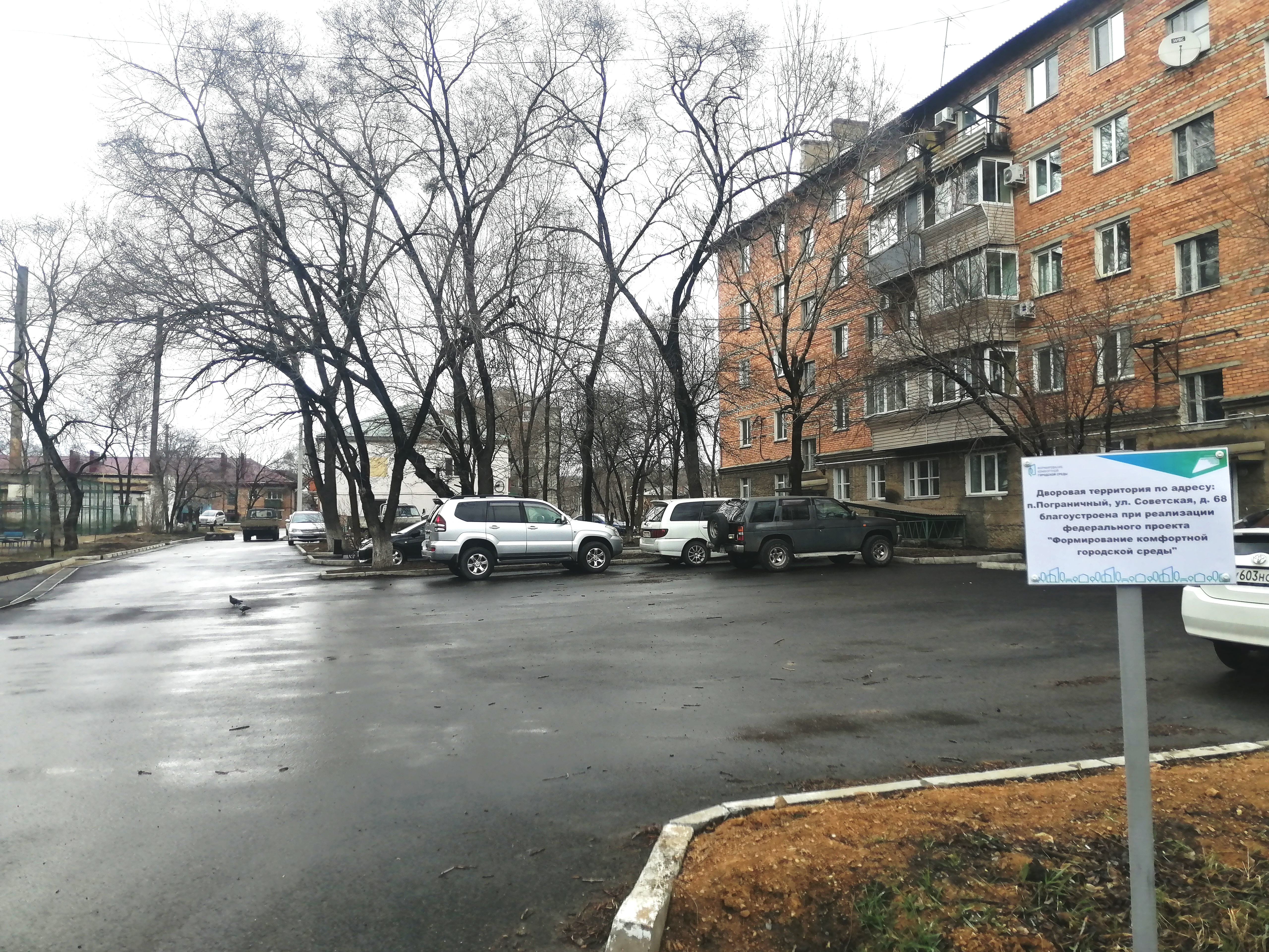 Благоустройство дворовой территории, пгт. Пограничный, ул. Советская, 68 (фото1, фото2)