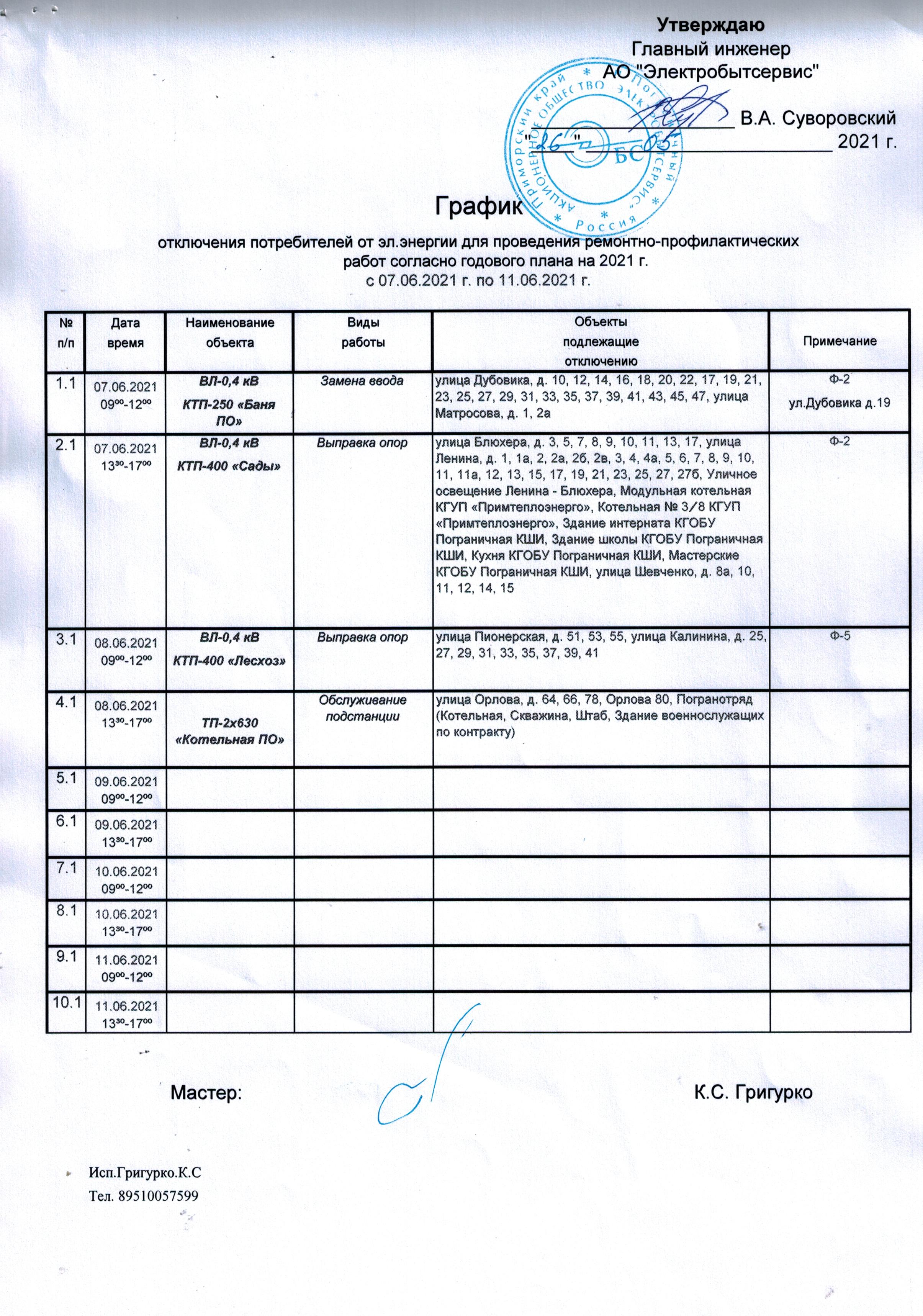 ГРАФИК ОТКЛЮЧЕНИЯ ПОТРЕБИТЕЛЕЙ ОТ ЭЛ.ЭНЕРГИИ ДЛЯ ПРОВЕДЕНИЯ РЕМОНТНО-ПРОФИЛАКТИЧЕСКИХ РАБОТ СОГЛАСНО ГОДОВОГО ПЛАНА НА 2021 Г. С 07.06.2021 ПО 11.06.2021