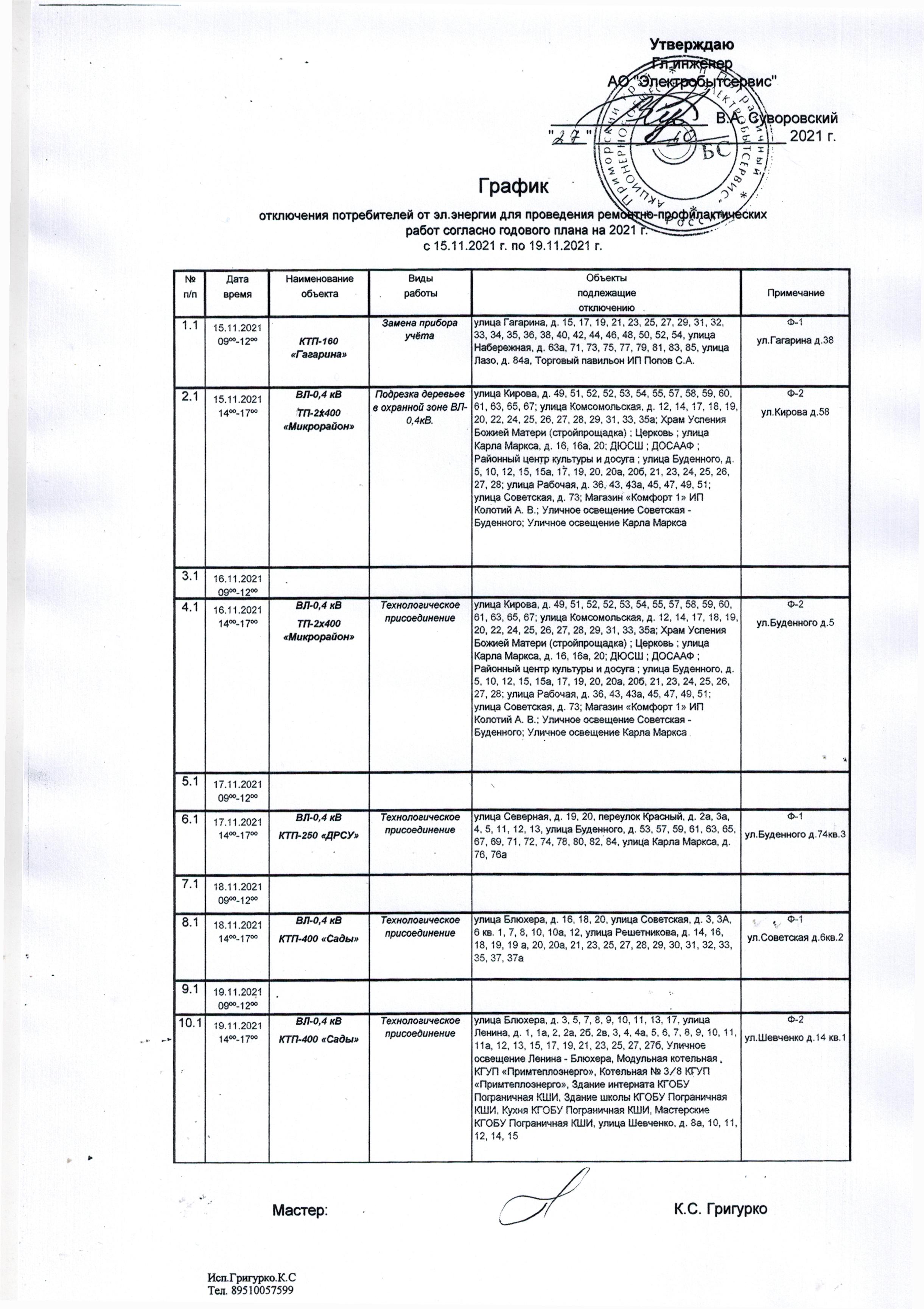 ГРАФИК ОТКЛЮЧЕНИЯ ПОТРЕБИТЕЛЕЙ ОТ ЭЛ.ЭНЕРГИИ ДЛЯ ПРОВЕДЕНИЯ РЕМОНТНО-ПРОФИЛАКТИЧЕСКИХ РАБОТ СОГЛАСНО ГОДОВОГО ПЛАНА НА 2021 Г. С 15.11.2021 ПО 19.11.2021