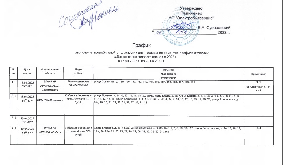ГРАФИК ОТКЛЮЧЕНИЯ ПОТРЕБИТЕЛЕЙ ОТ ЭЛ.ЭНЕРГИИ ДЛЯ ПРОВЕДЕНИЯ РЕМОНТНО-ПРОФИЛАКТИЧЕСКИХ РАБОТ СОГЛАСНО ГОДОВОГО ПЛАНА НА 2021 Г. С 18.04.2022 ПО 22.04.2022