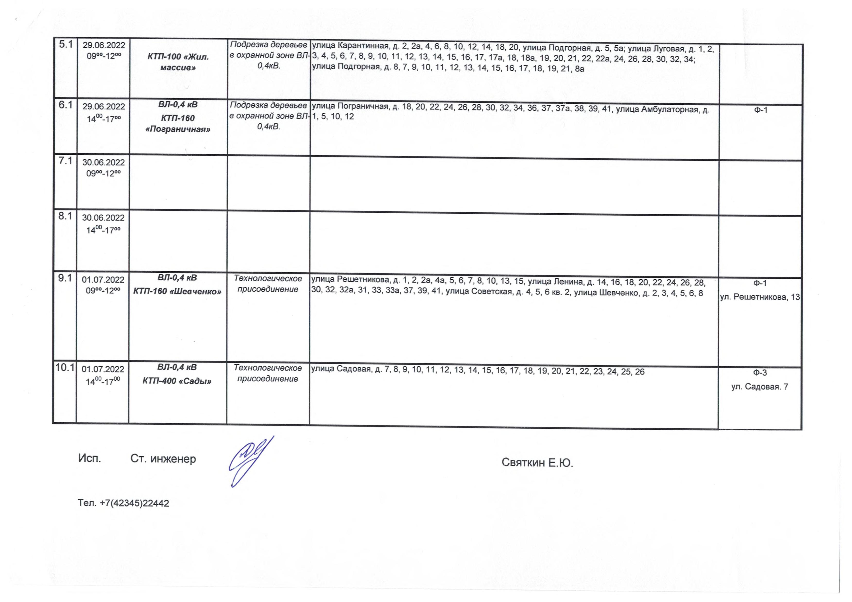 ГРАФИК ОТКЛЮЧЕНИЯ ПОТРЕБИТЕЛЕЙ ОТ ЭЛ.ЭНЕРГИИ ДЛЯ ПРОВЕДЕНИЯ РЕМОНТНО-ПРОФИЛАКТИЧЕСКИХ РАБОТ СОГЛАСНО ГОДОВОГО ПЛАНА НА 2022 Г. С 27.06.2021 ПО 01.07.2022