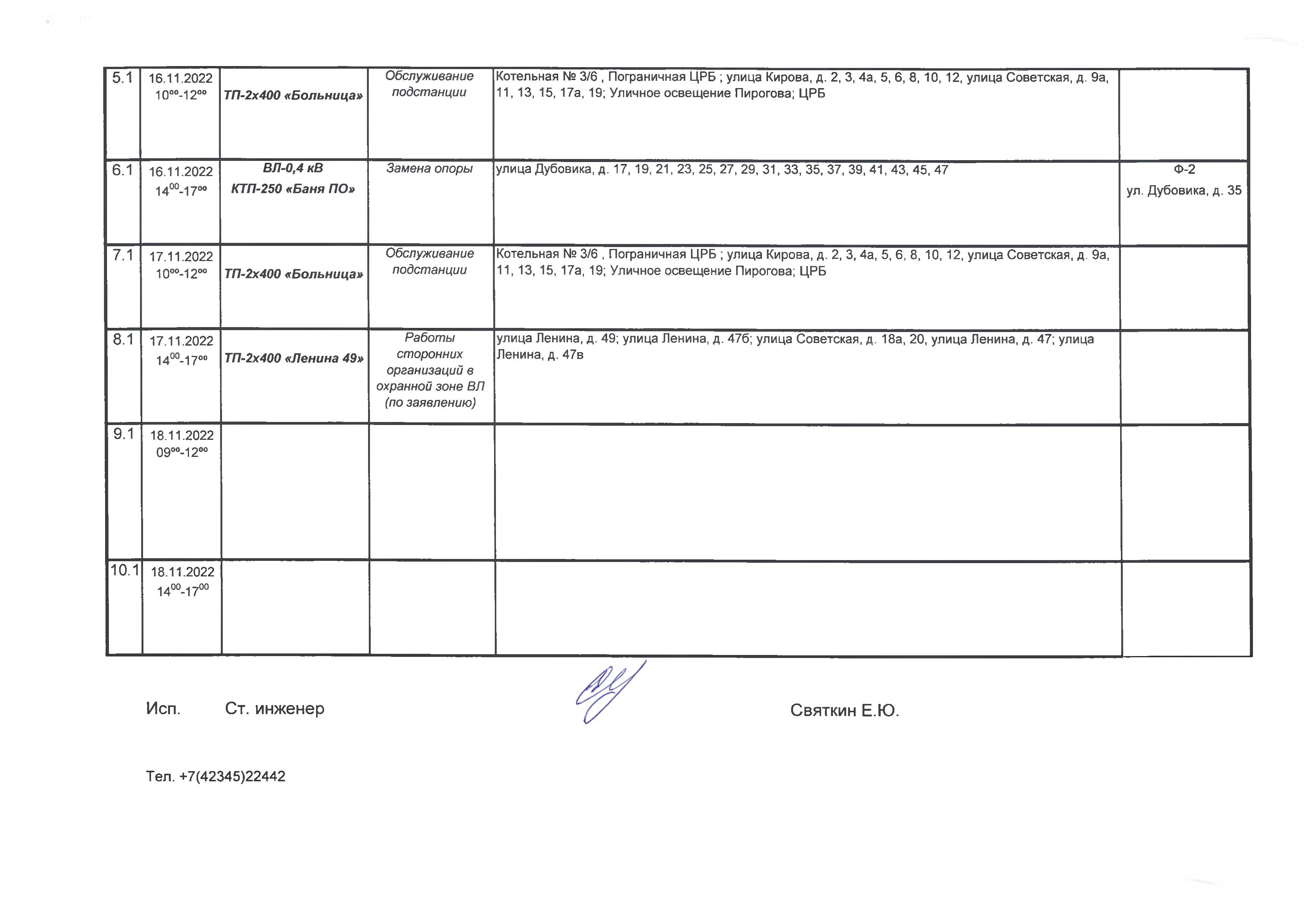 График отключения потребителей от эл.энергии для проведения ремонтно-профилактических работ согласно годового плана на 2022 г. с 14.11.2022 г. по 18.11.2022 г.
